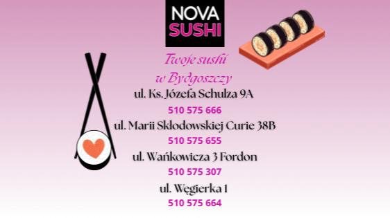 Nova Sushi przy ul. Schulza 9a w Bydgoszczy to restauracja sushi, która powstała z pasji, talentu niesamowitego zespołu i miłości do kuchni japońskiej. To wyjątkowe miejsce dla ludzi szukających nowych doznań kulinarnych i lubiących delektować pysznymi daniami w eleganckim, ale swobodnym klimacie. W naszej restauracji sushi serwujemy świeże zestawy, sushi w tempurze, zupy i desery przygotowane z najwyższej jakości składników. Nova Sushi w Bydgoszczy zaprasza – to idealne miejsce, by delektować pysznymi daniami swoim domu lub w naszej sali. Restauracja stworzona dla osób szukających nowych doznań kulinarnych i autentycznych smaków Japonii.